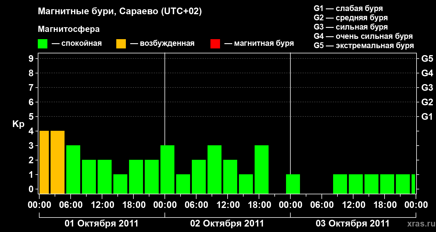 Изменения геомагнитного индекса Kp с 1 по 3 октября 2011 года для средних широт