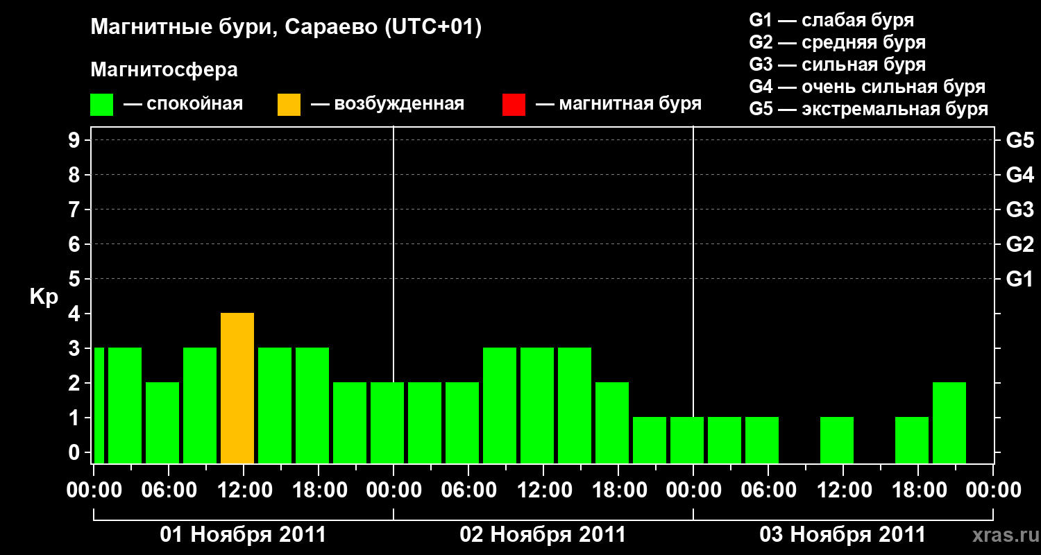 Изменения геомагнитного индекса Kp с 1 по 3 ноября 2011 года для средних широт