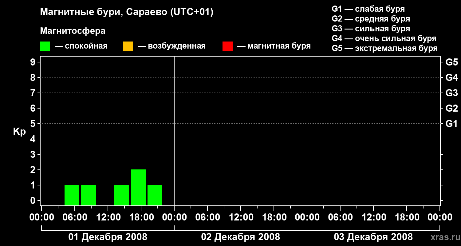 Изменения геомагнитного индекса Kp с 1 по 3 декабря 2008 года для средних широт