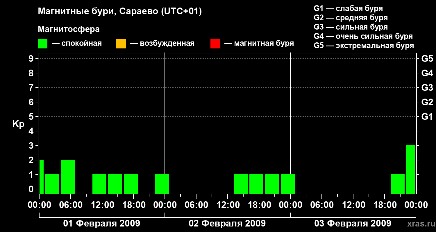 Изменения геомагнитного индекса Kp с 1 по 3 февраля 2009 года для средних широт