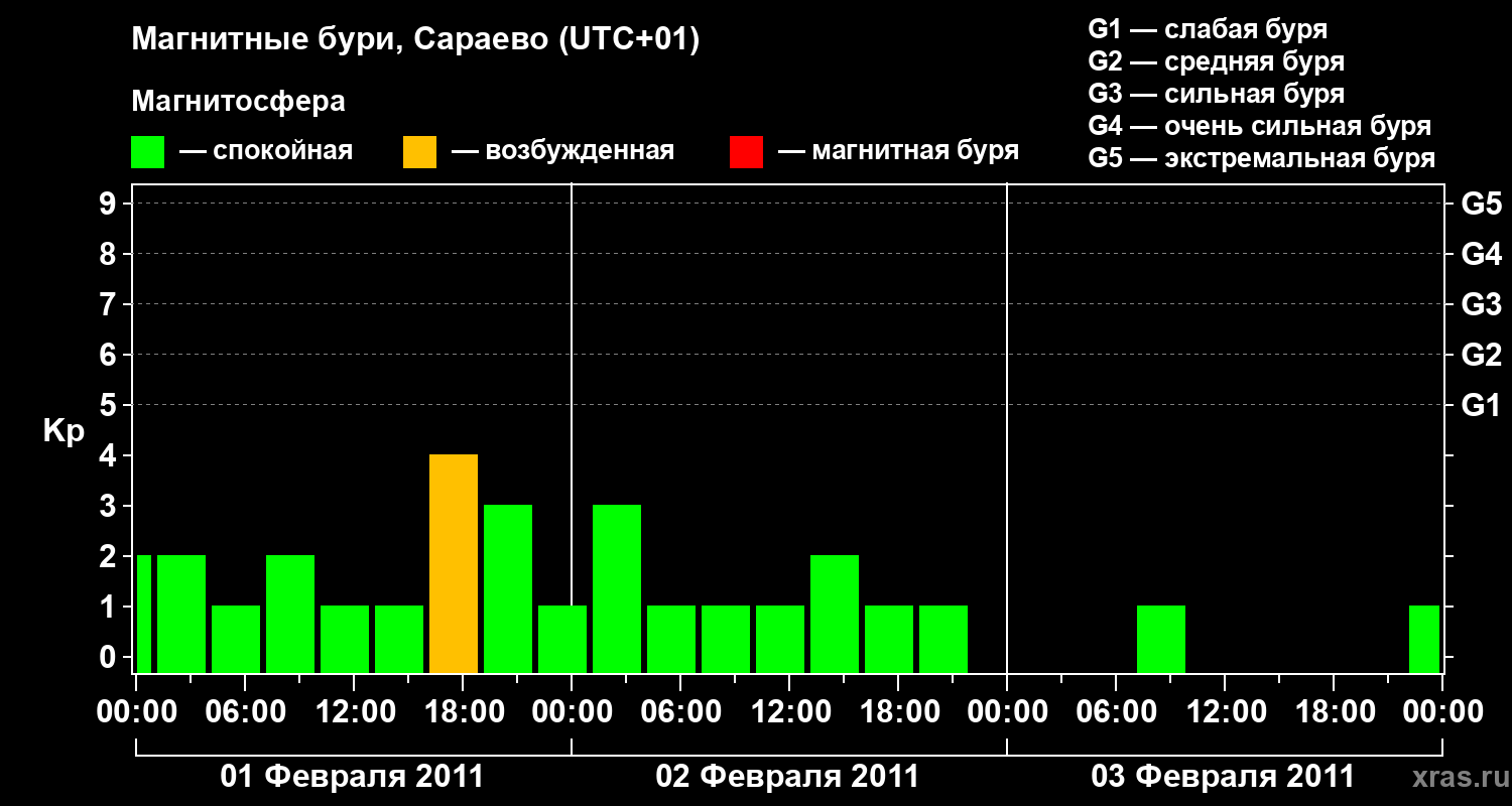 Изменения геомагнитного индекса Kp с 1 по 3 февраля 2011 года для средних широт