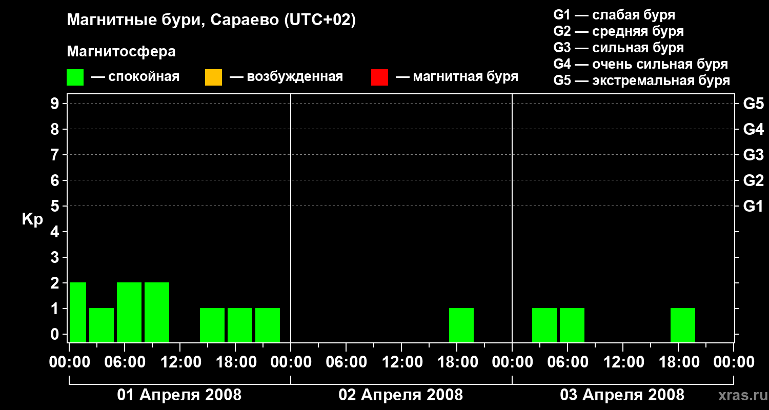 Изменения геомагнитного индекса Kp с 1 по 3 апреля 2008 года для средних широт