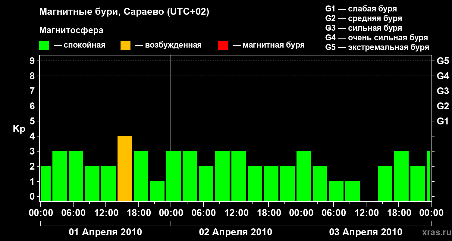 Изменения геомагнитного индекса Kp с 1 по 3 апреля 2010 года для средних широт
