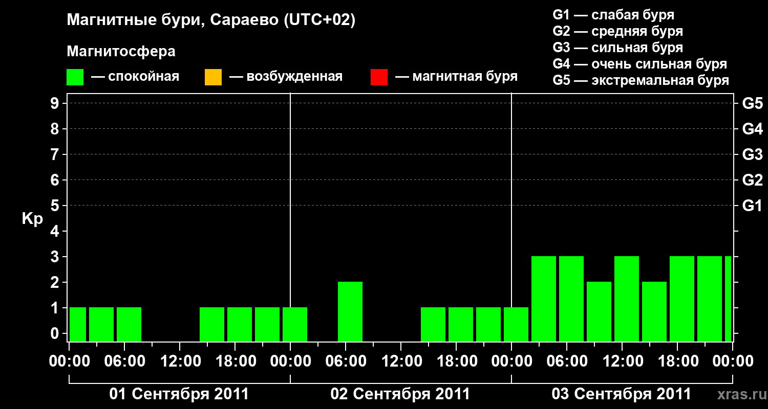 Изменения геомагнитного индекса Kp с 1 по 3 сентября 2011 года для средних широт