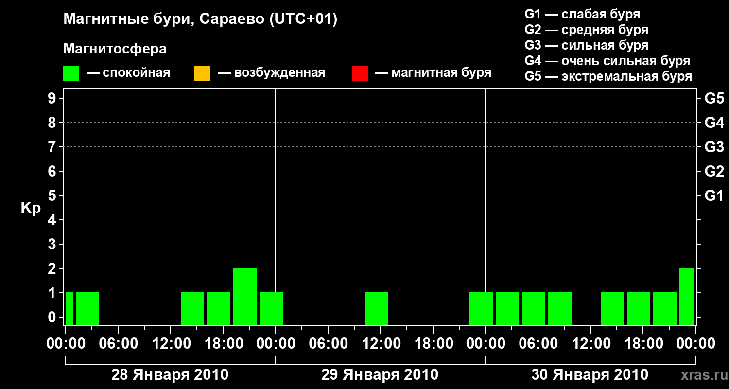 Изменения геомагнитного индекса Kp с 28 по 30 января 2010 года для средних широт
