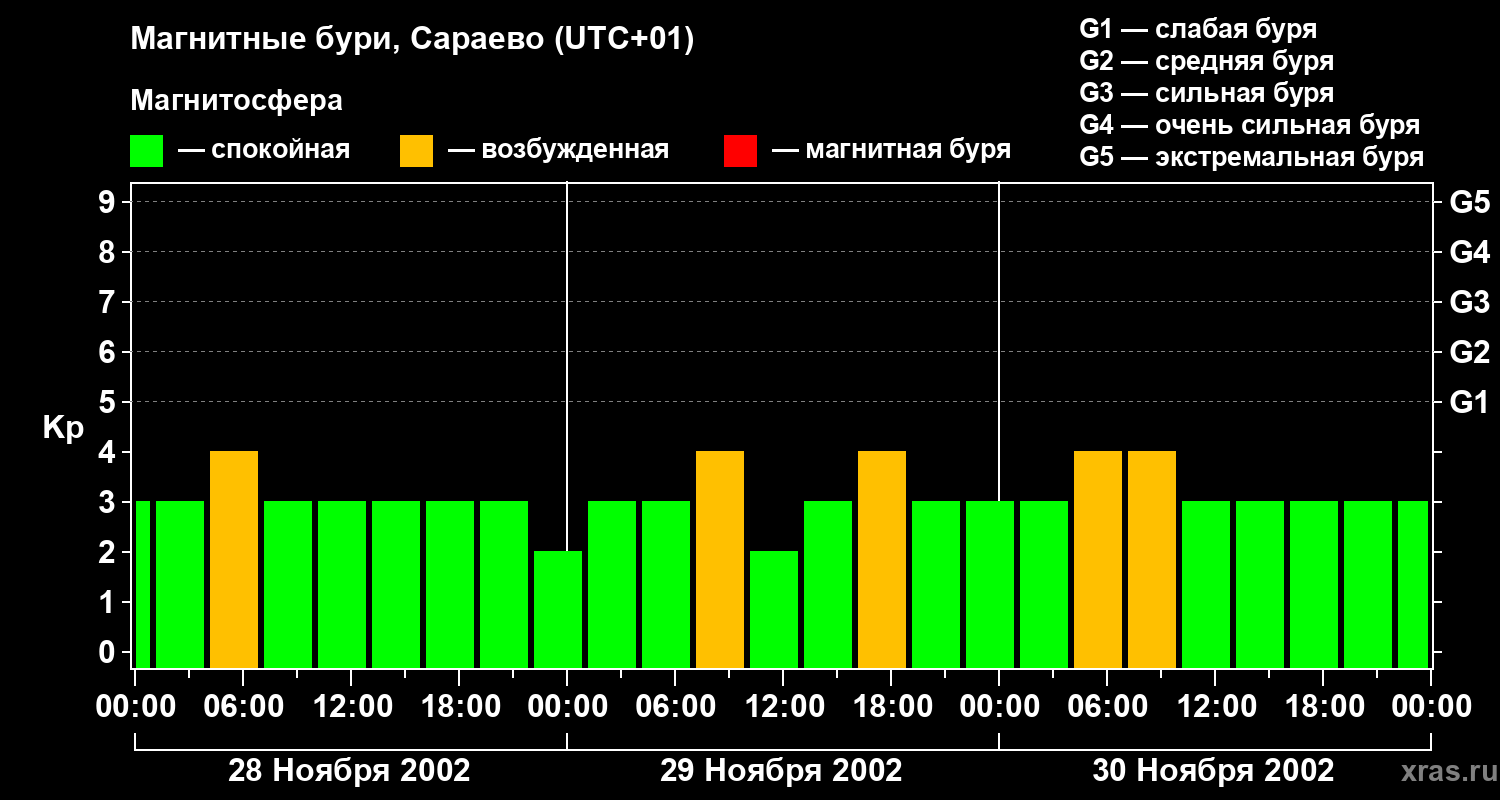 Изменения геомагнитного индекса Kp с 28 по 30 ноября 2002 года для средних широт