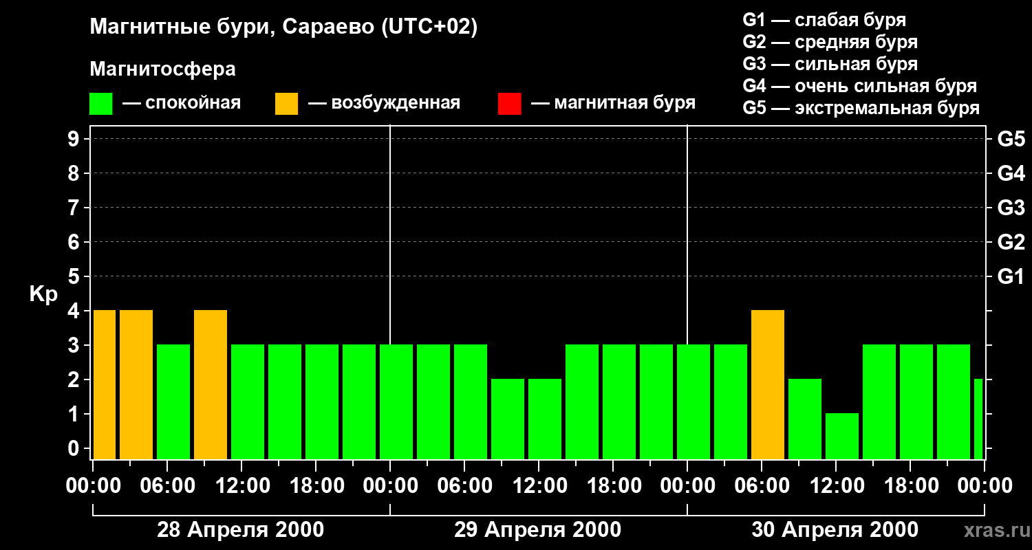 Изменения геомагнитного индекса Kp с 28 по 30 апреля 2000 года для средних широт
