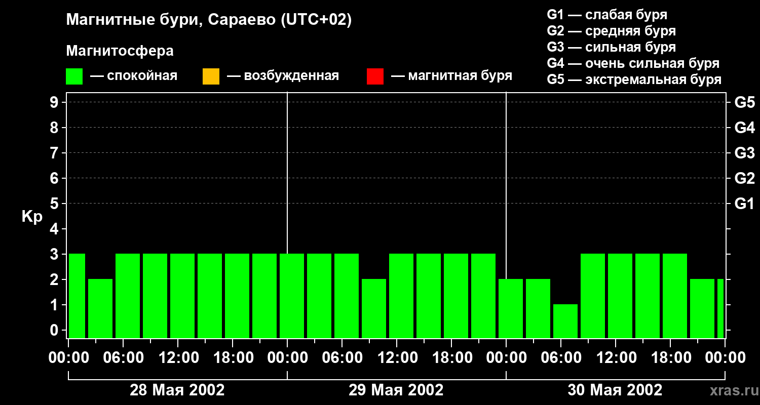 Изменения геомагнитного индекса Kp с 28 по 30 мая 2002 года для средних широт