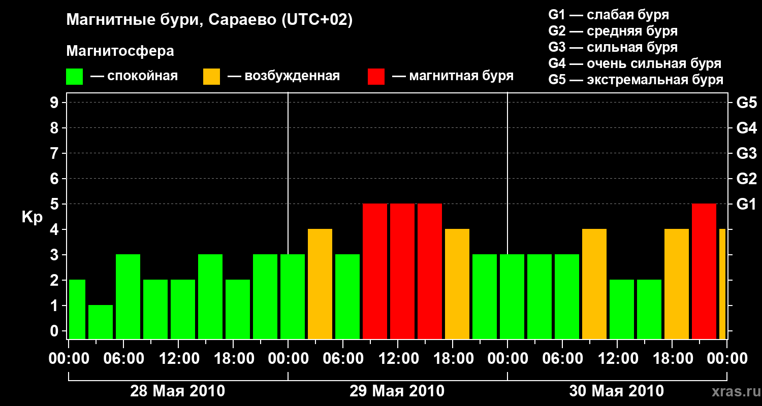 Изменения геомагнитного индекса Kp с 28 по 30 мая 2010 года для средних широт
