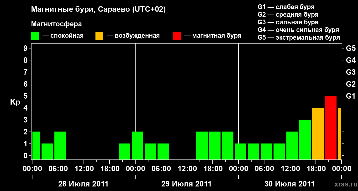 Изменения геомагнитного индекса Kp с 28 по 30 июля 2011 года для средних широт