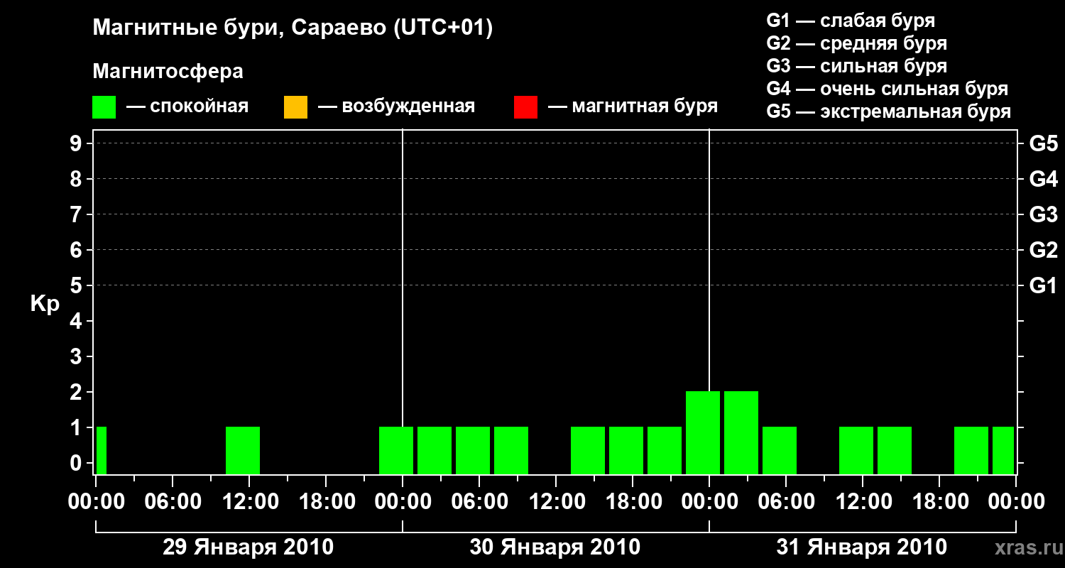 Изменения геомагнитного индекса Kp с 29 по 31 января 2010 года для средних широт