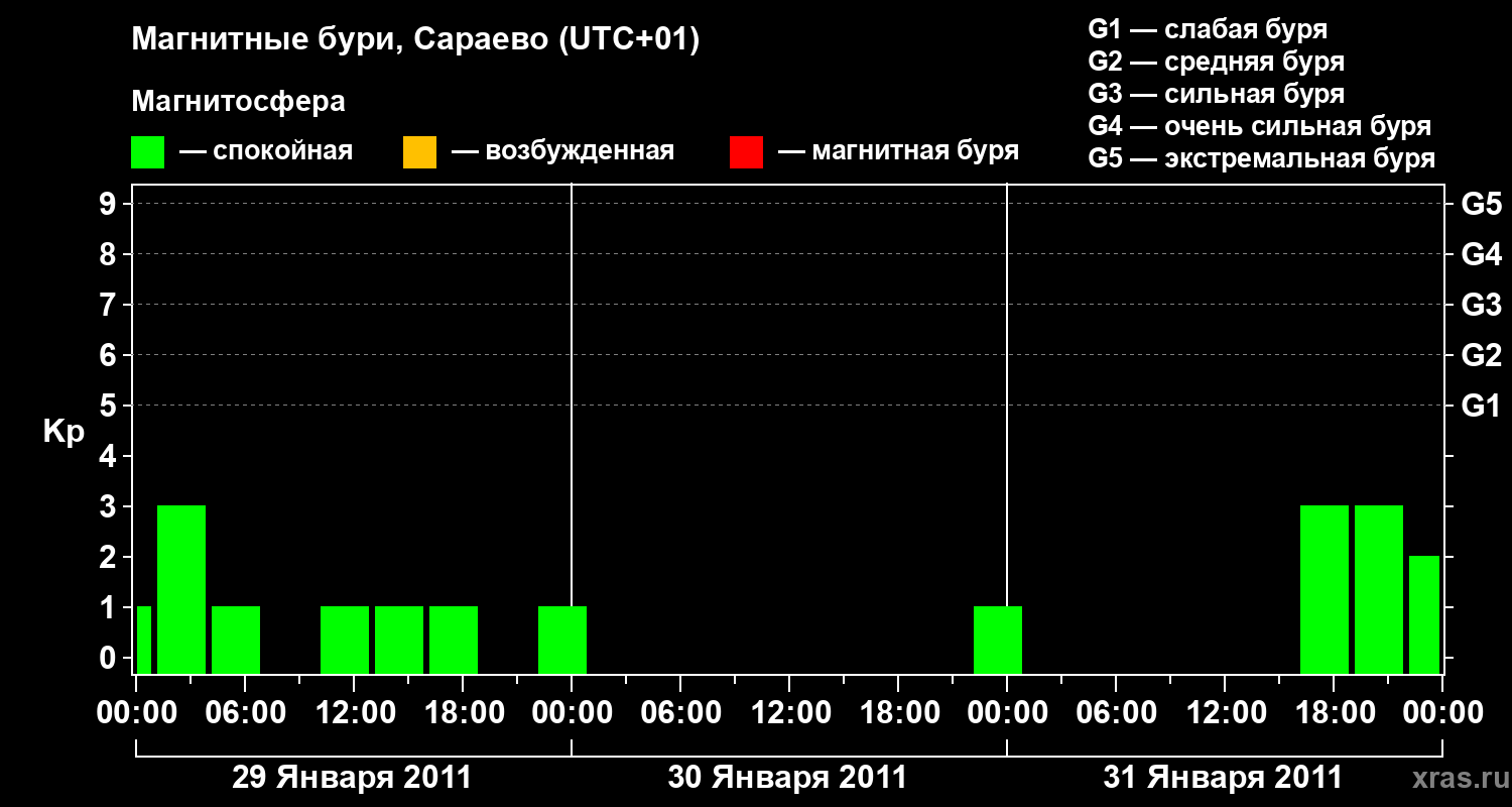 Изменения геомагнитного индекса Kp с 29 по 31 января 2011 года для средних широт