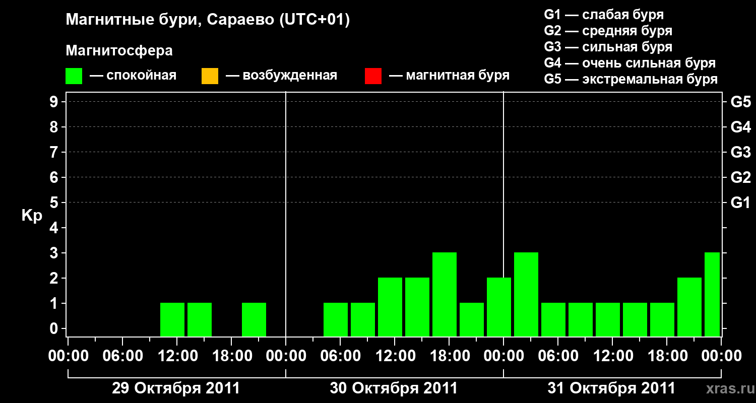 Изменения геомагнитного индекса Kp с 29 по 31 октября 2011 года для средних широт