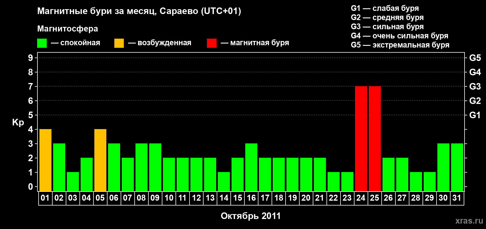 Изменения максимального суточного геомагнитного индекса Kp в октябре 2011 года для средних широт