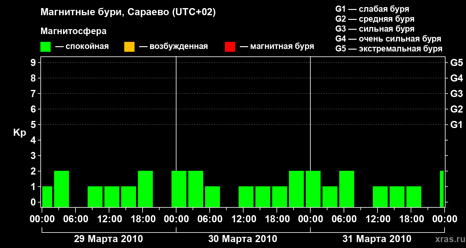 Изменения геомагнитного индекса Kp с 29 по 31 марта 2010 года для средних широт