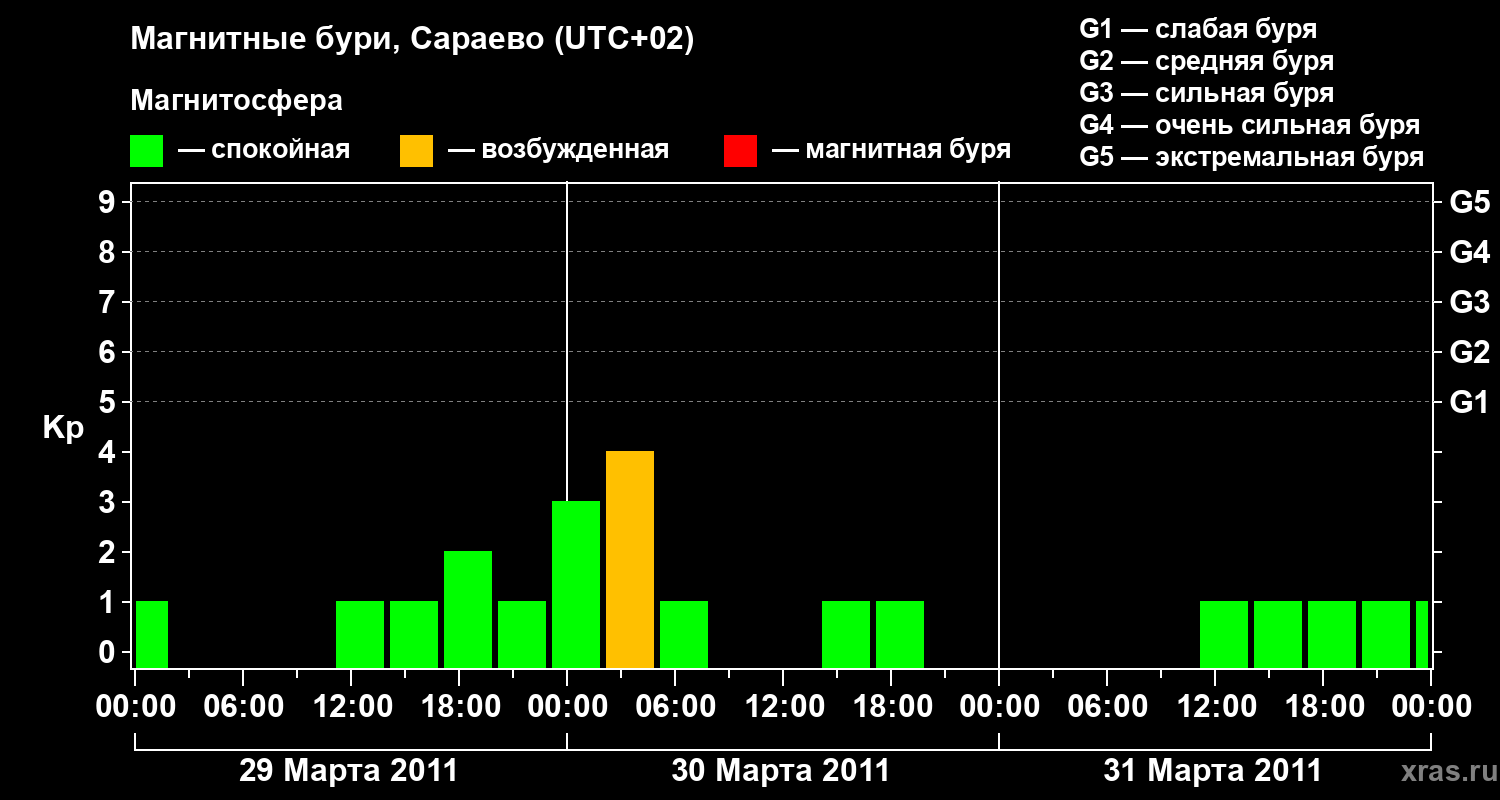 Изменения геомагнитного индекса Kp с 29 по 31 марта 2011 года для средних широт