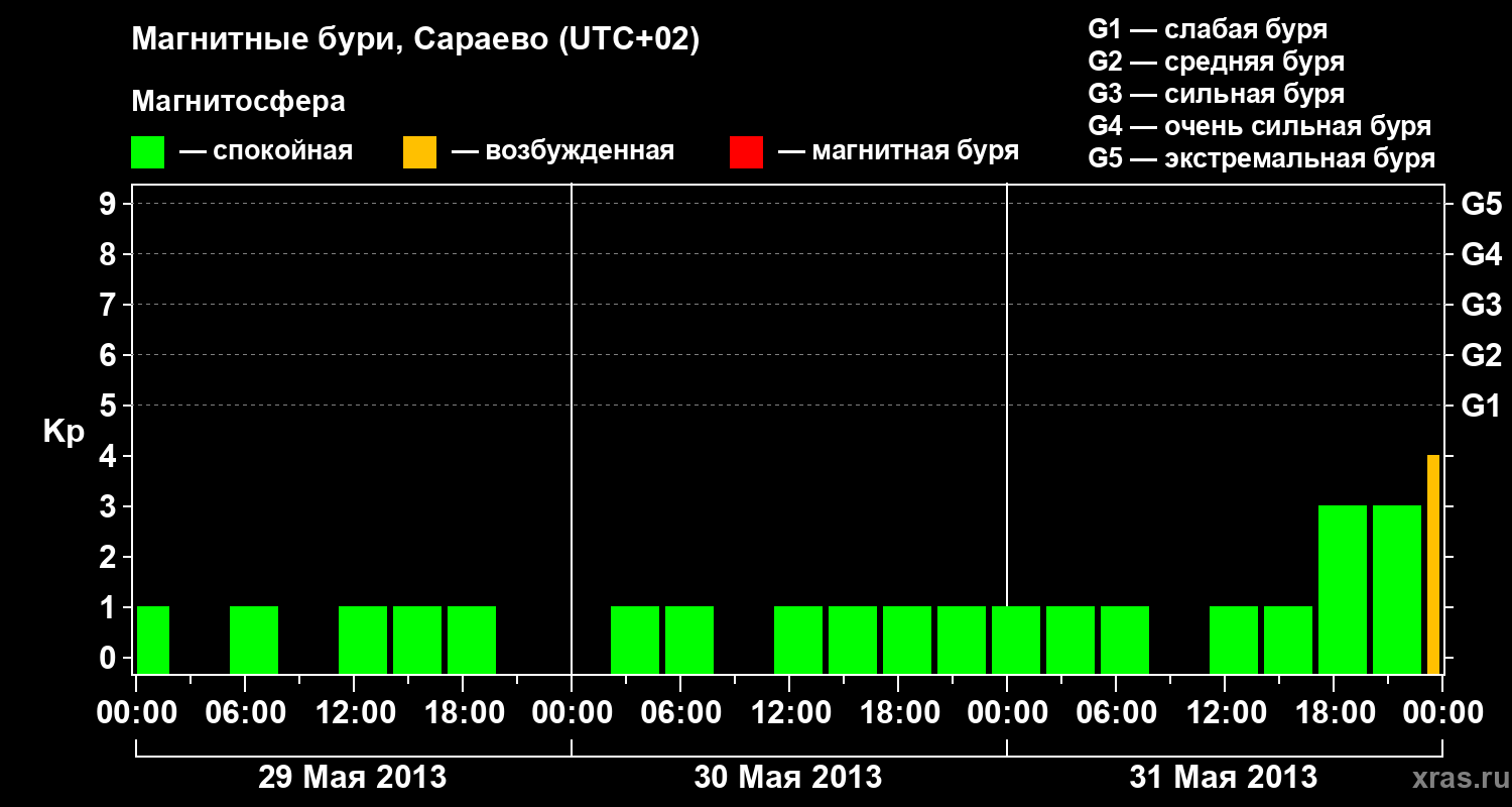 Изменения геомагнитного индекса Kp с 29 по 31 мая 2013 года для средних широт