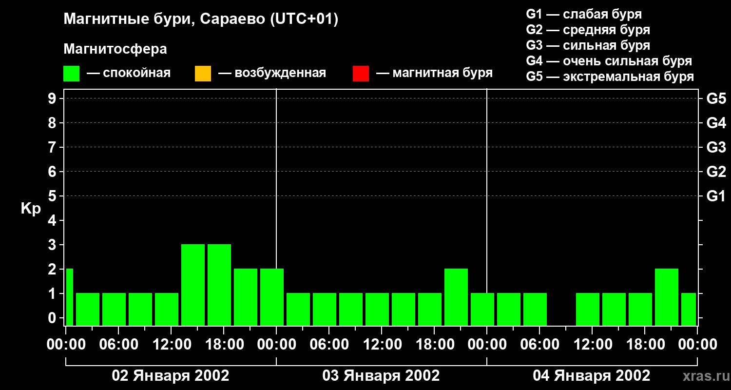 Изменения геомагнитного индекса Kp с 2 по 4 января 2002 года для средних широт
