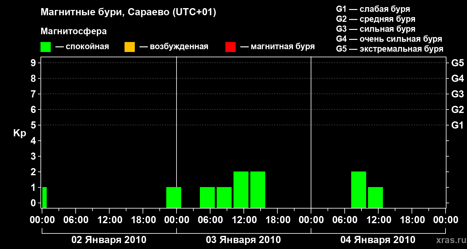 Изменения геомагнитного индекса Kp с 2 по 4 января 2010 года для средних широт