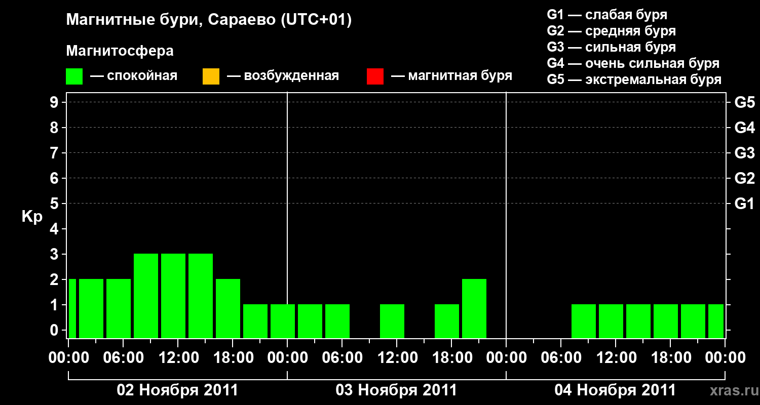 Изменения геомагнитного индекса Kp с 2 по 4 ноября 2011 года для средних широт