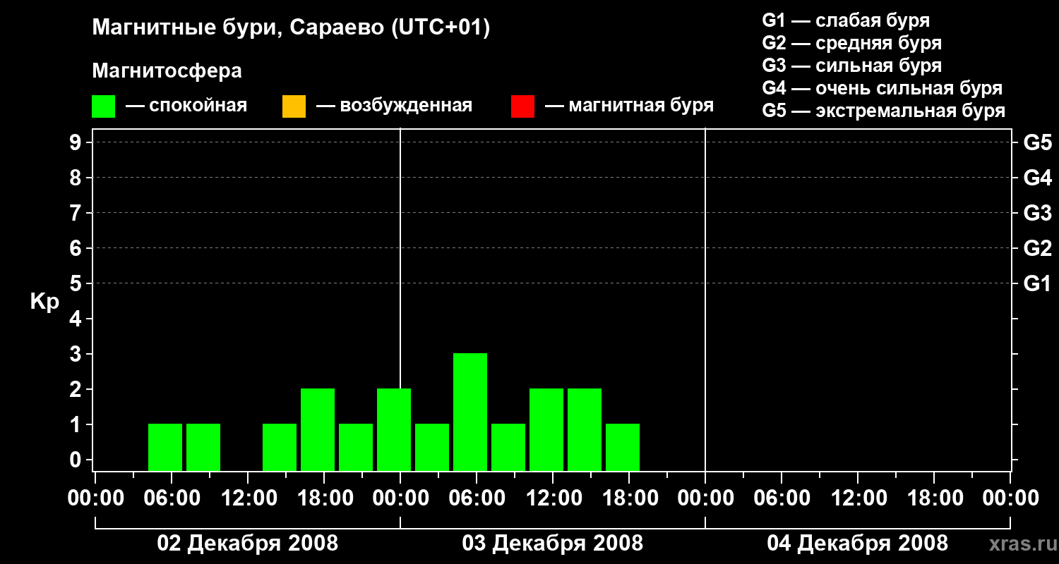 Изменения геомагнитного индекса Kp с 2 по 4 декабря 2008 года для средних широт