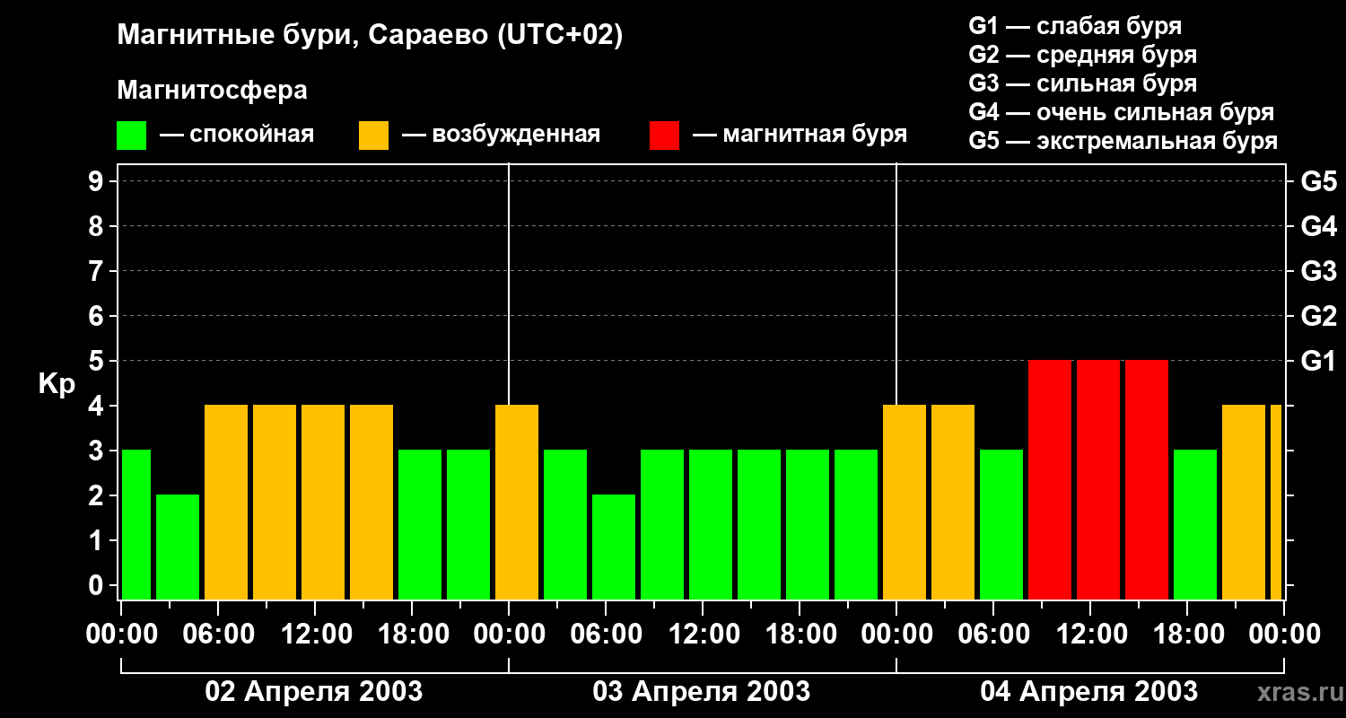 Изменения геомагнитного индекса Kp с 2 по 4 апреля 2003 года для средних широт