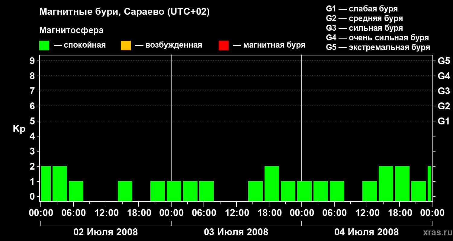 Изменения геомагнитного индекса Kp с 2 по 4 июля 2008 года для средних широт