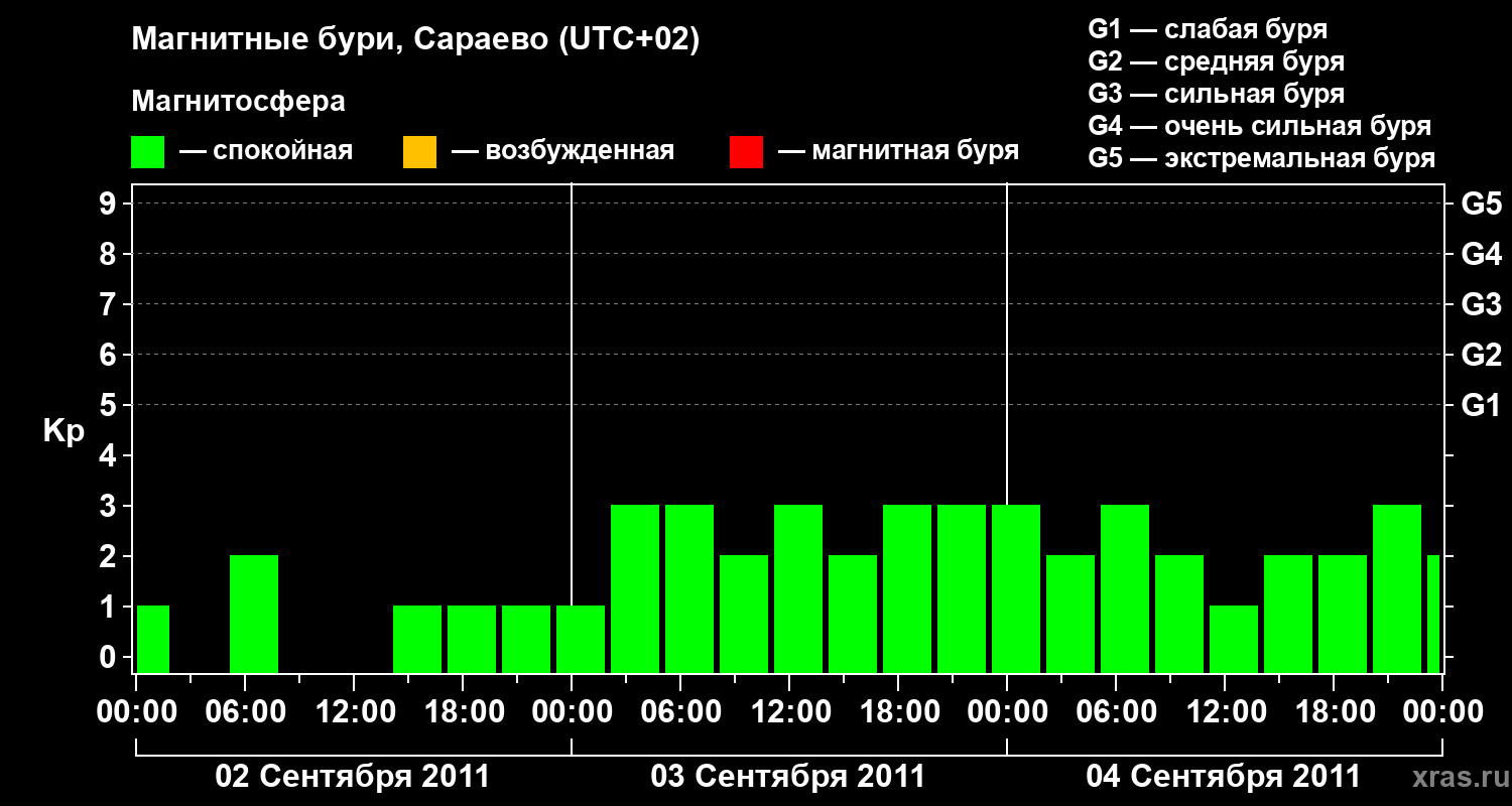 Изменения геомагнитного индекса Kp с 2 по 4 сентября 2011 года для средних широт