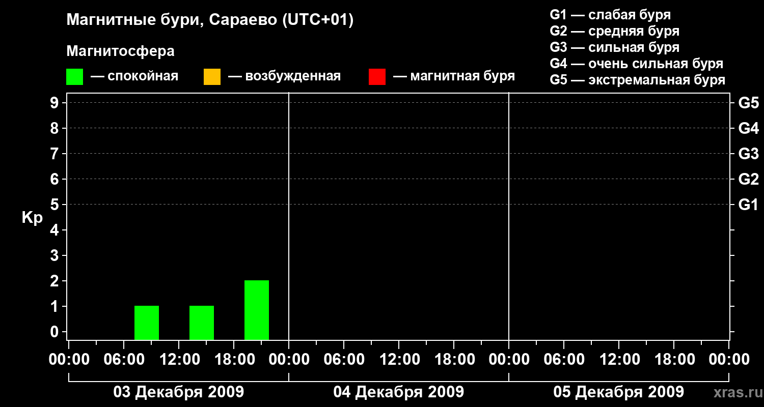 Изменения геомагнитного индекса Kp с 3 по 5 декабря 2009 года для средних широт