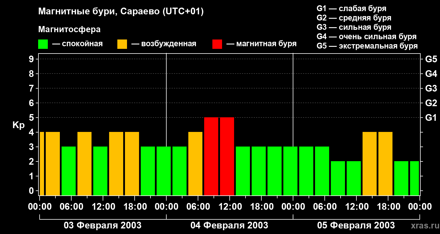 Изменения геомагнитного индекса Kp с 3 по 5 февраля 2003 года для средних широт