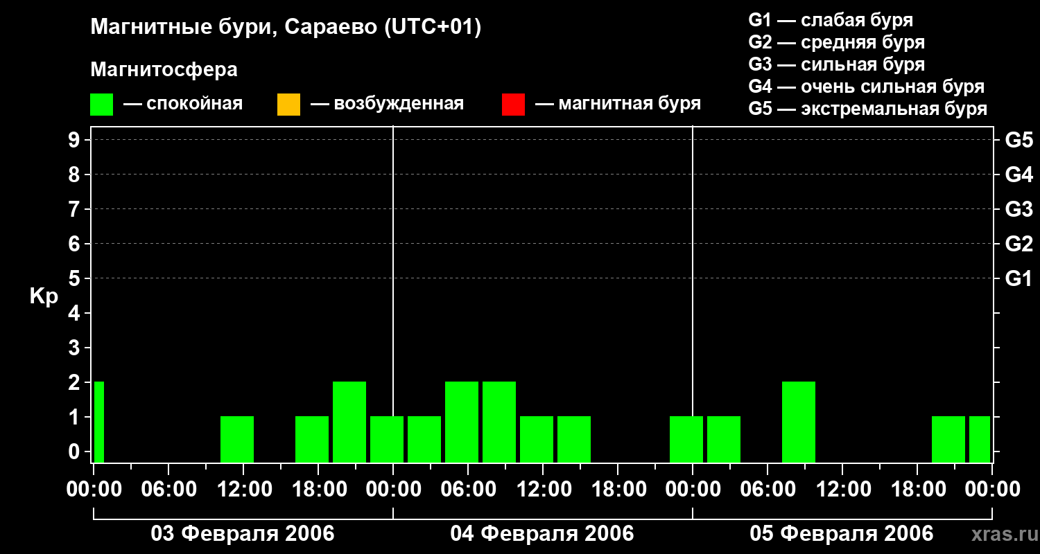 Изменения геомагнитного индекса Kp с 3 по 5 февраля 2006 года для средних широт