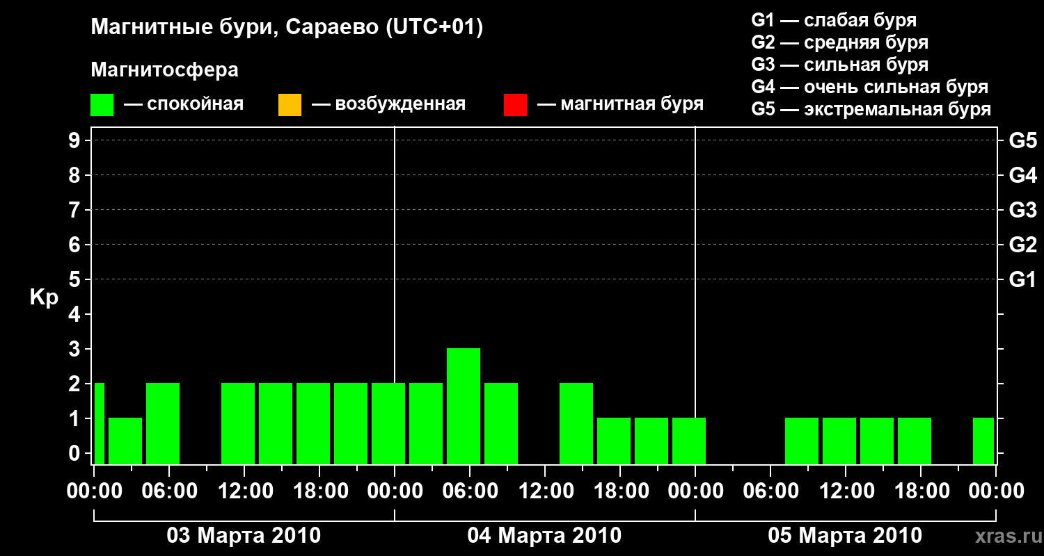 Изменения геомагнитного индекса Kp с 3 по 5 марта 2010 года для средних широт