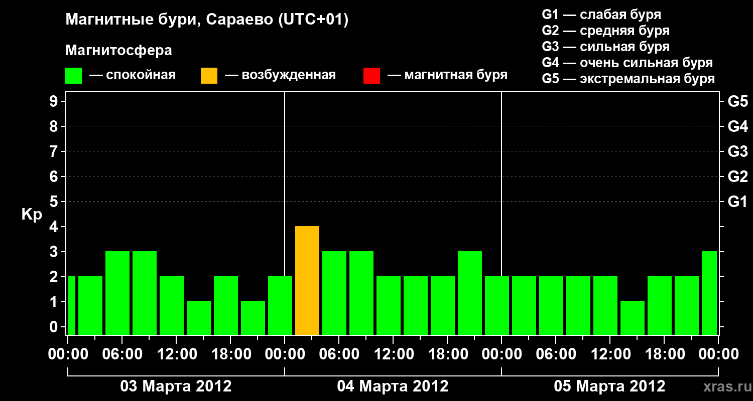 Изменения геомагнитного индекса Kp с 3 по 5 марта 2012 года для средних широт