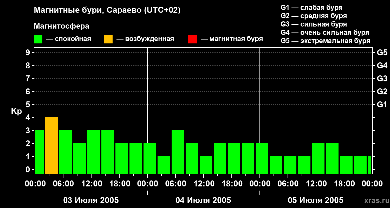 Изменения геомагнитного индекса Kp с 3 по 5 июля 2005 года для средних широт