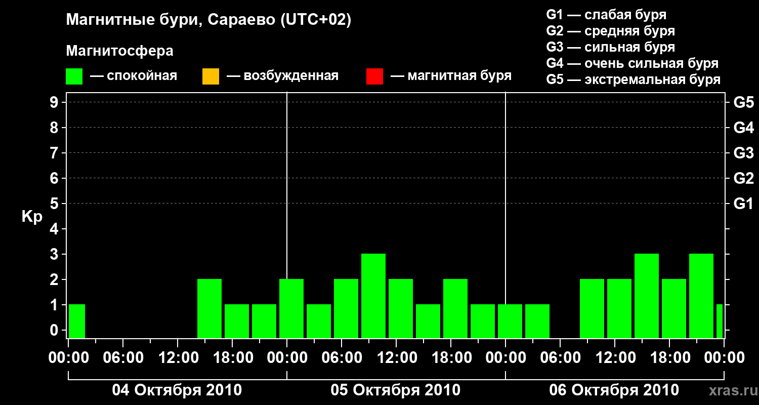 Изменения геомагнитного индекса Kp с 4 по 6 октября 2010 года для средних широт