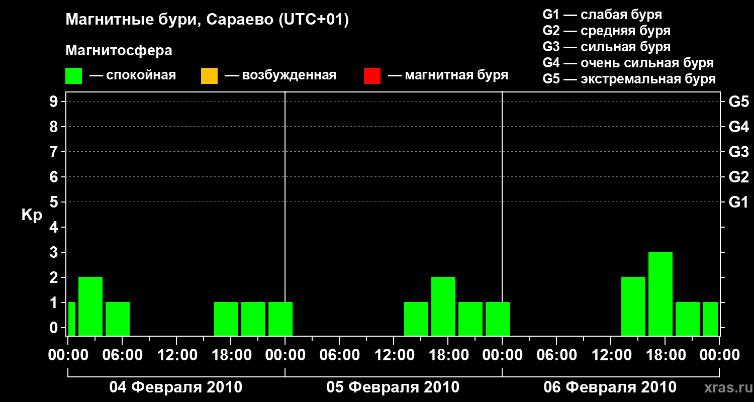 Изменения геомагнитного индекса Kp с 4 по 6 февраля 2010 года для средних широт