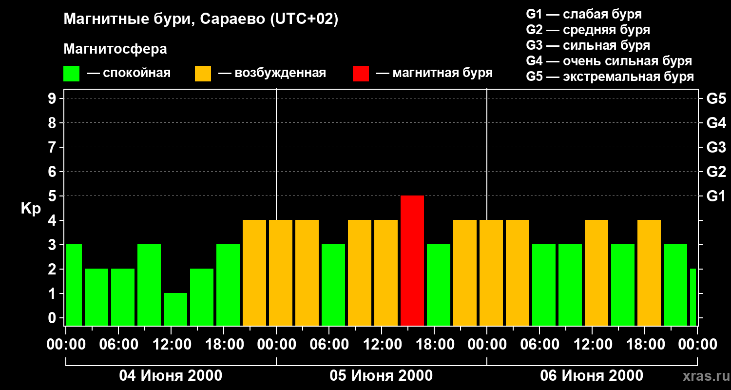 Изменения геомагнитного индекса Kp с 4 по 6 июня 2000 года для средних широт