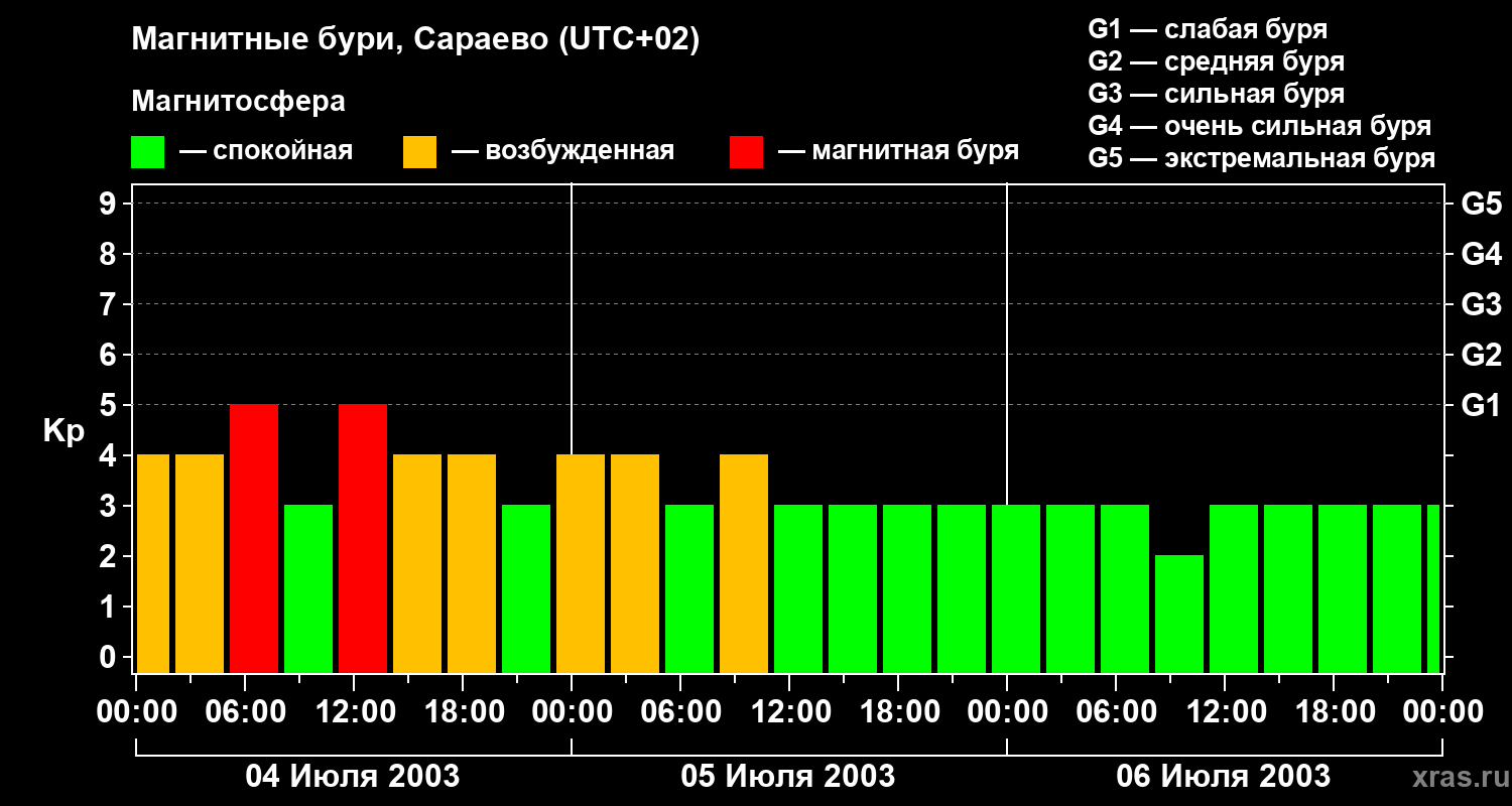 Изменения геомагнитного индекса Kp с 4 по 6 июля 2003 года для средних широт