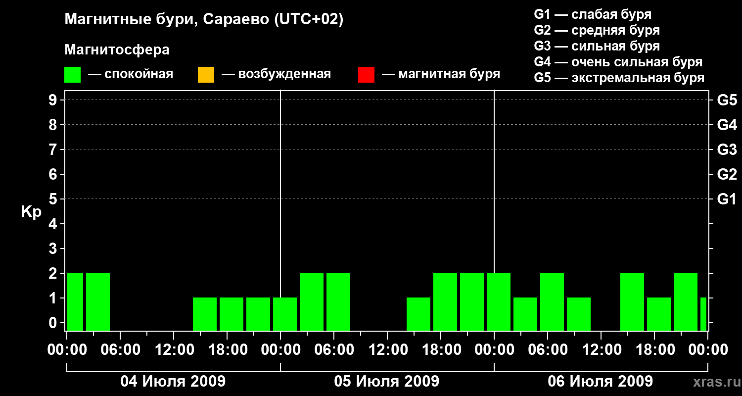 Изменения геомагнитного индекса Kp с 4 по 6 июля 2009 года для средних широт