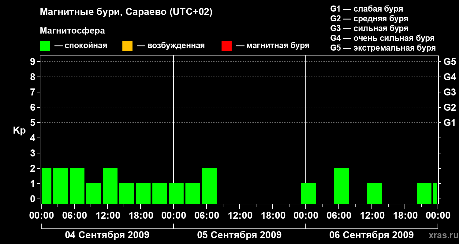 Изменения геомагнитного индекса Kp с 4 по 6 сентября 2009 года для средних широт