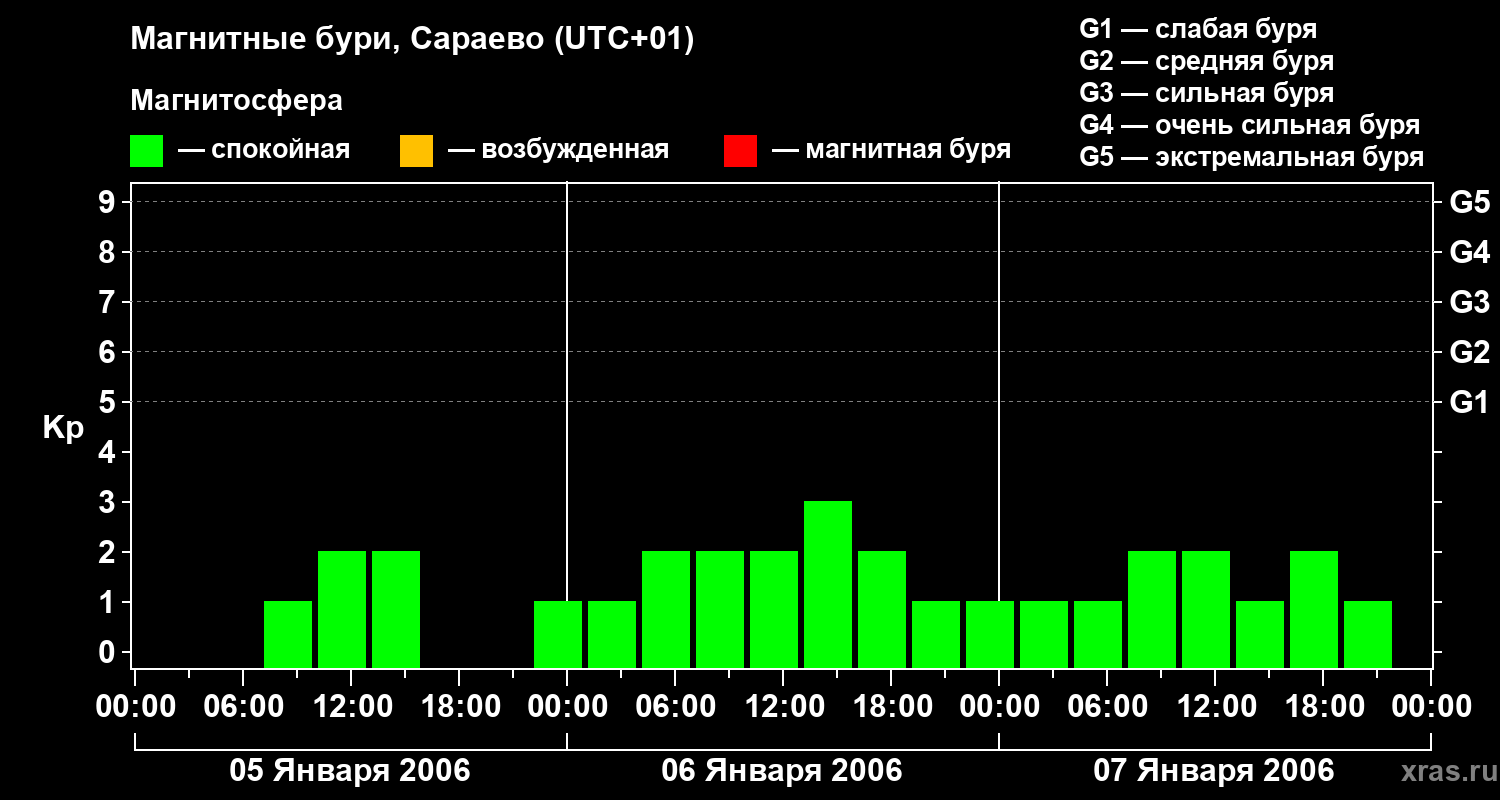 Изменения геомагнитного индекса Kp с 5 по 7 января 2006 года для средних широт