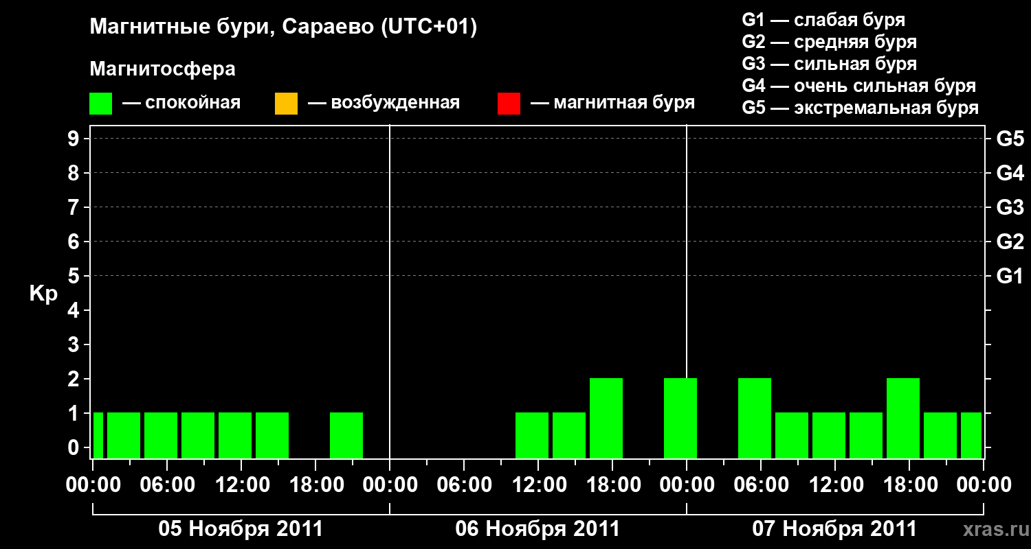 Изменения геомагнитного индекса Kp с 5 по 7 ноября 2011 года для средних широт