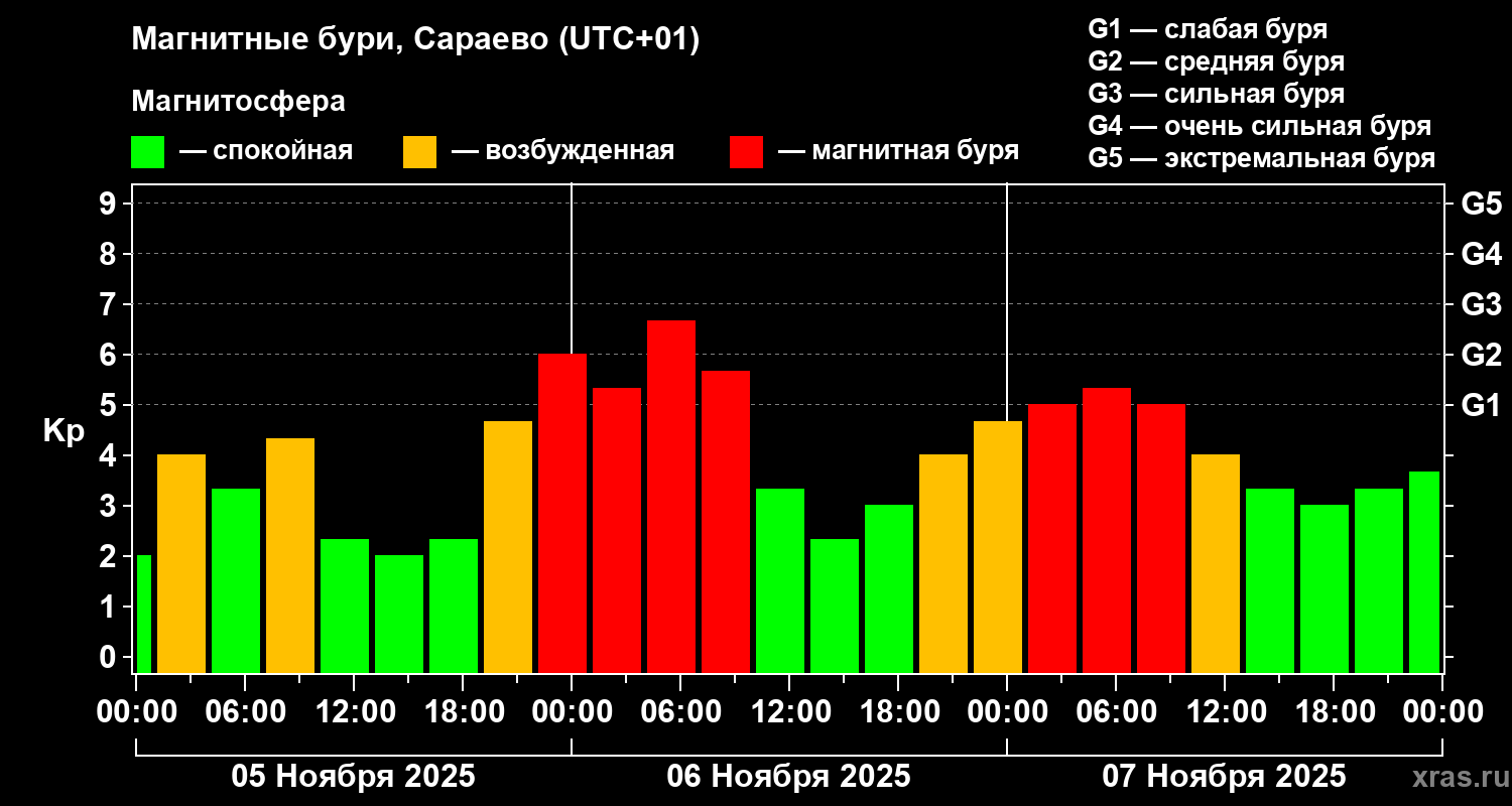 Изменения геомагнитного индекса Kp с 5 по 7 ноября 2025 года для средних широт