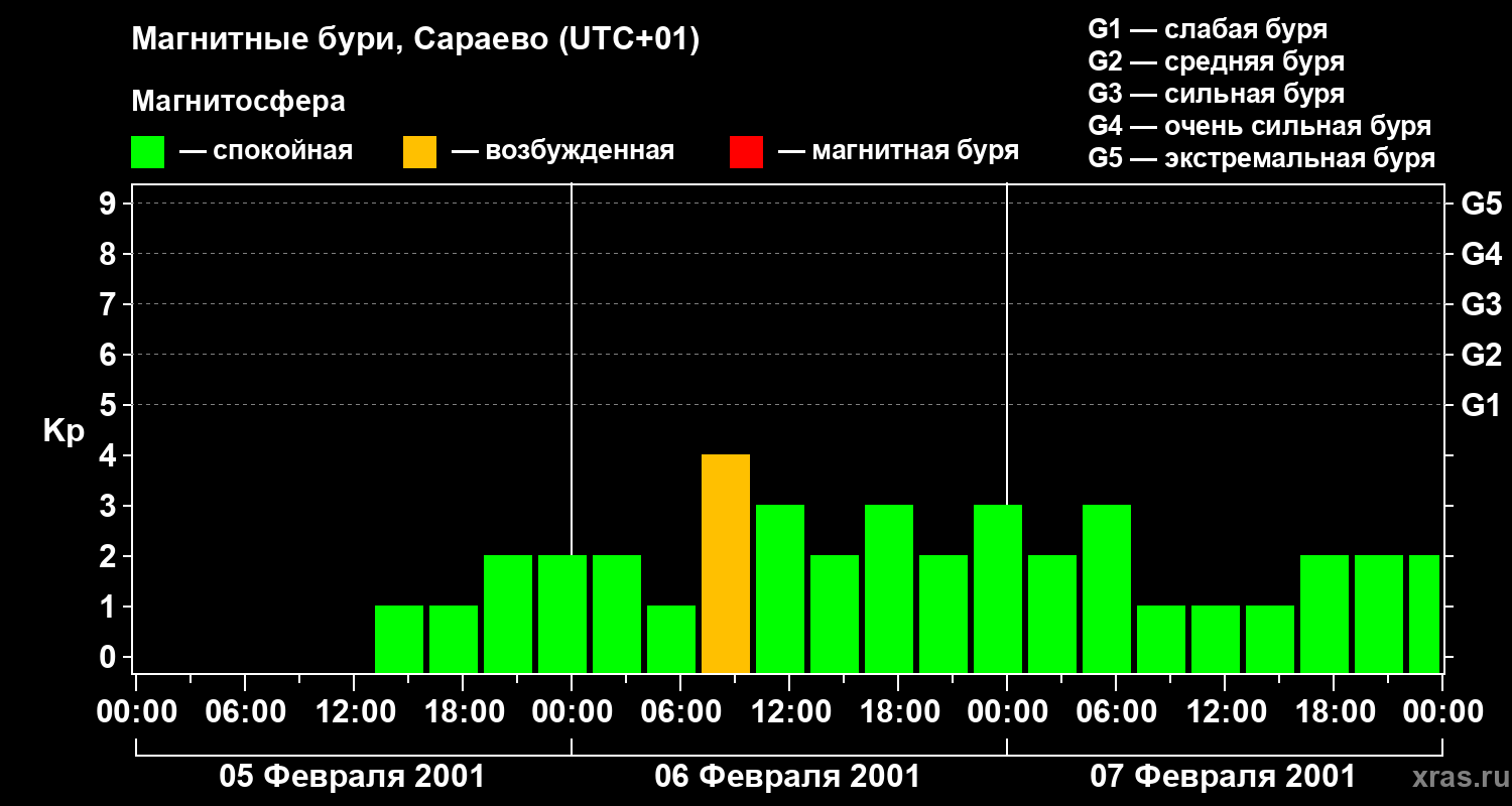 Изменения геомагнитного индекса Kp с 5 по 7 февраля 2001 года для средних широт