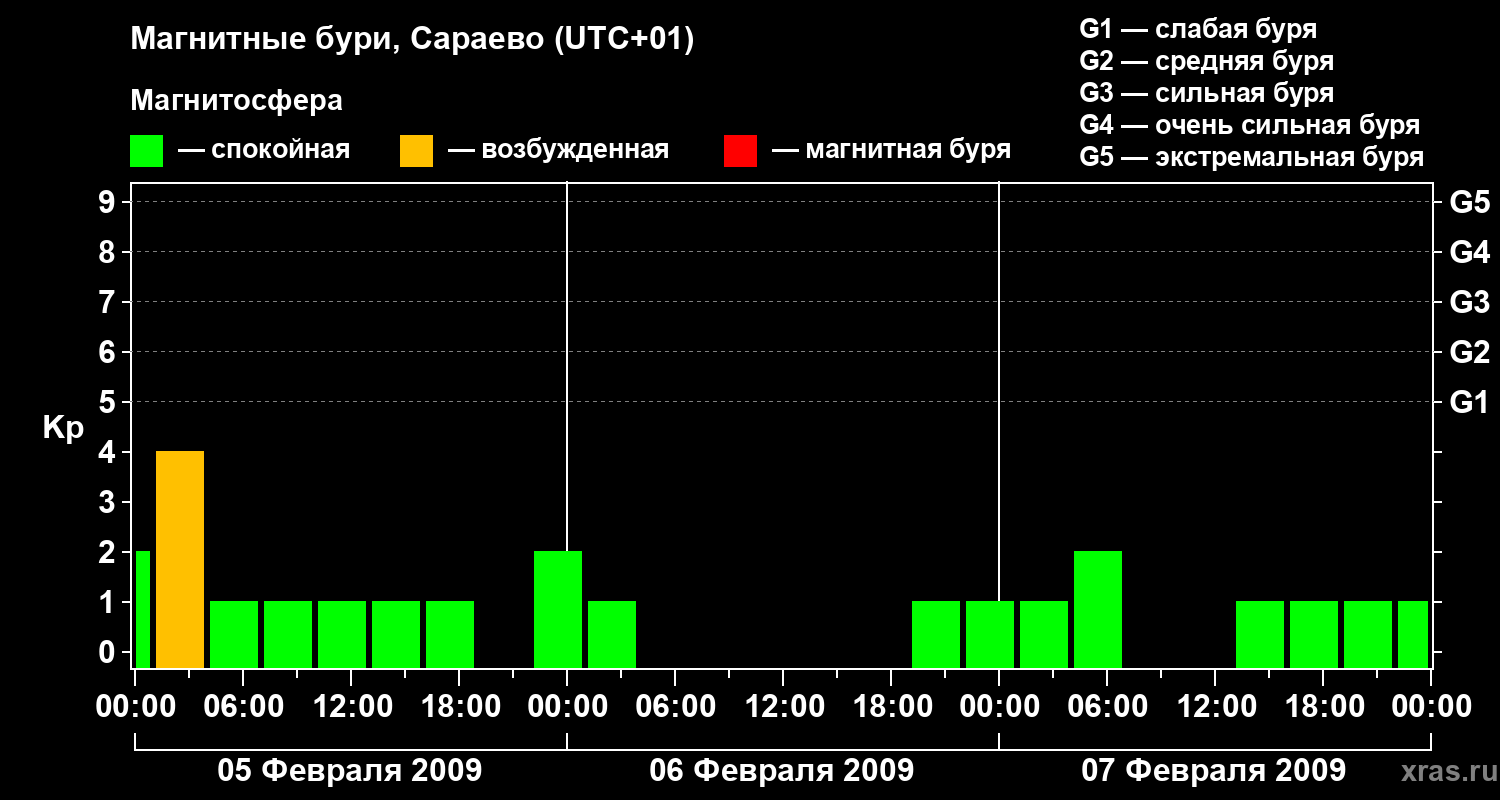 Изменения геомагнитного индекса Kp с 5 по 7 февраля 2009 года для средних широт
