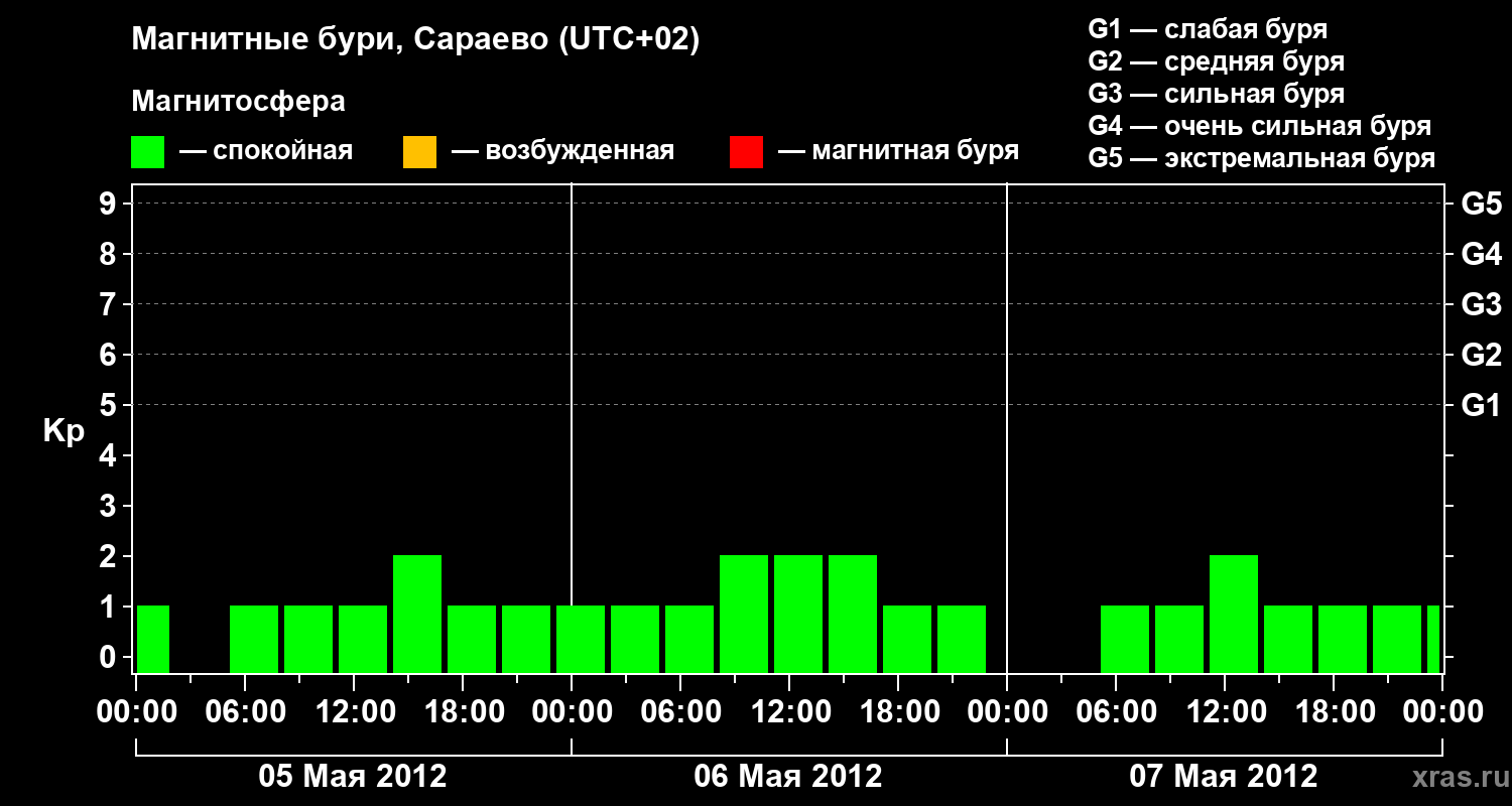 Изменения геомагнитного индекса Kp с 5 по 7 мая 2012 года для средних широт