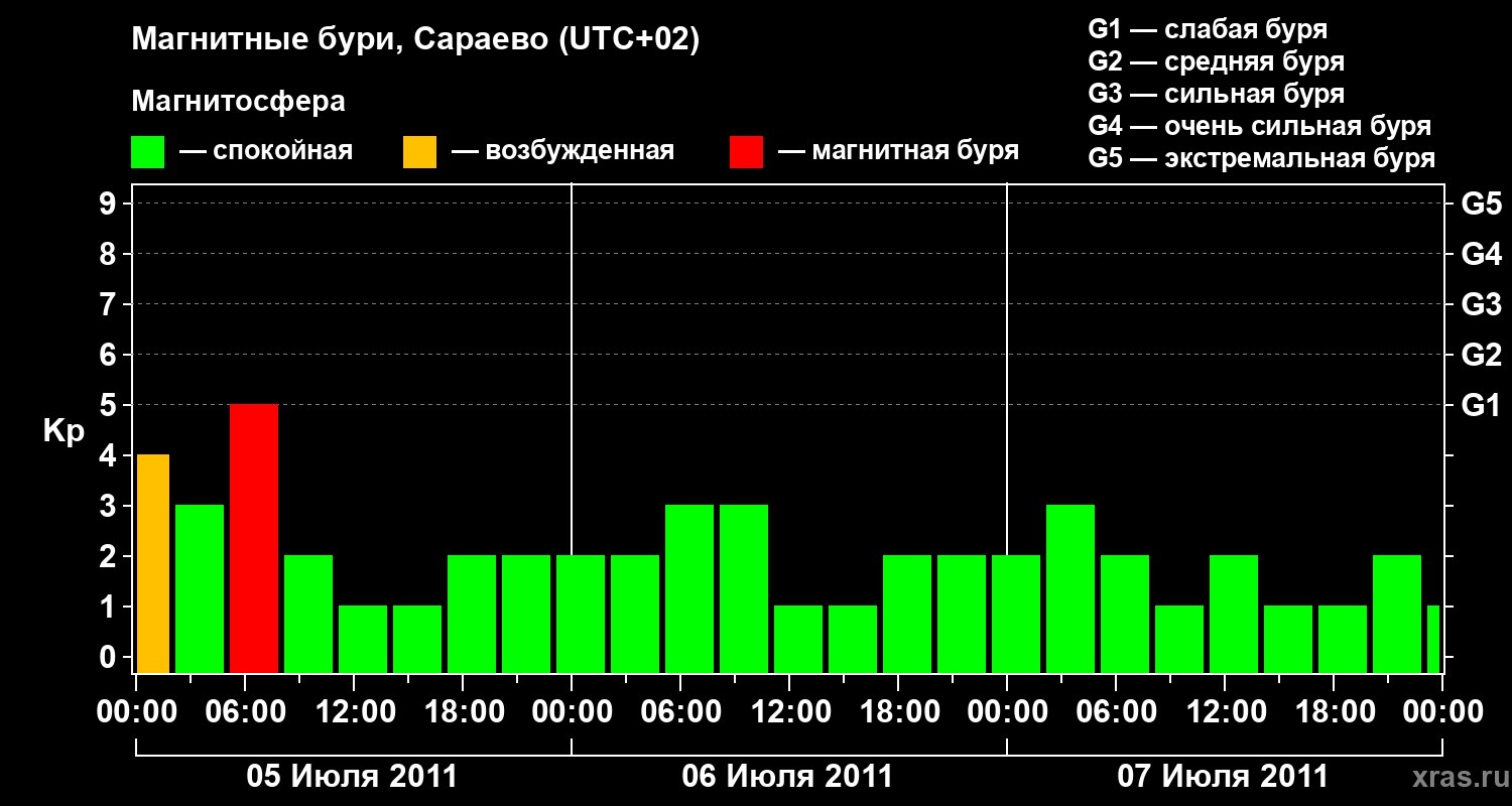 Изменения геомагнитного индекса Kp с 5 по 7 июля 2011 года для средних широт