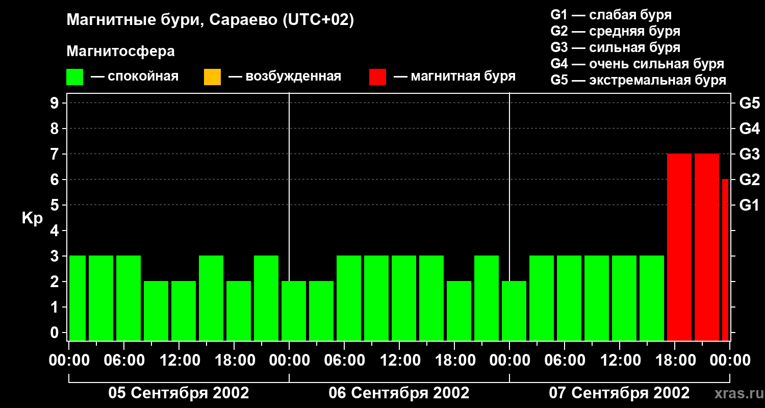 Изменения геомагнитного индекса Kp с 5 по 7 сентября 2002 года для средних широт