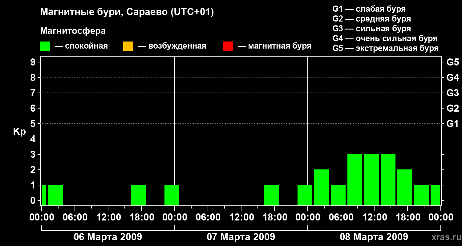 Изменения геомагнитного индекса Kp с 6 по 8 марта 2009 года для средних широт