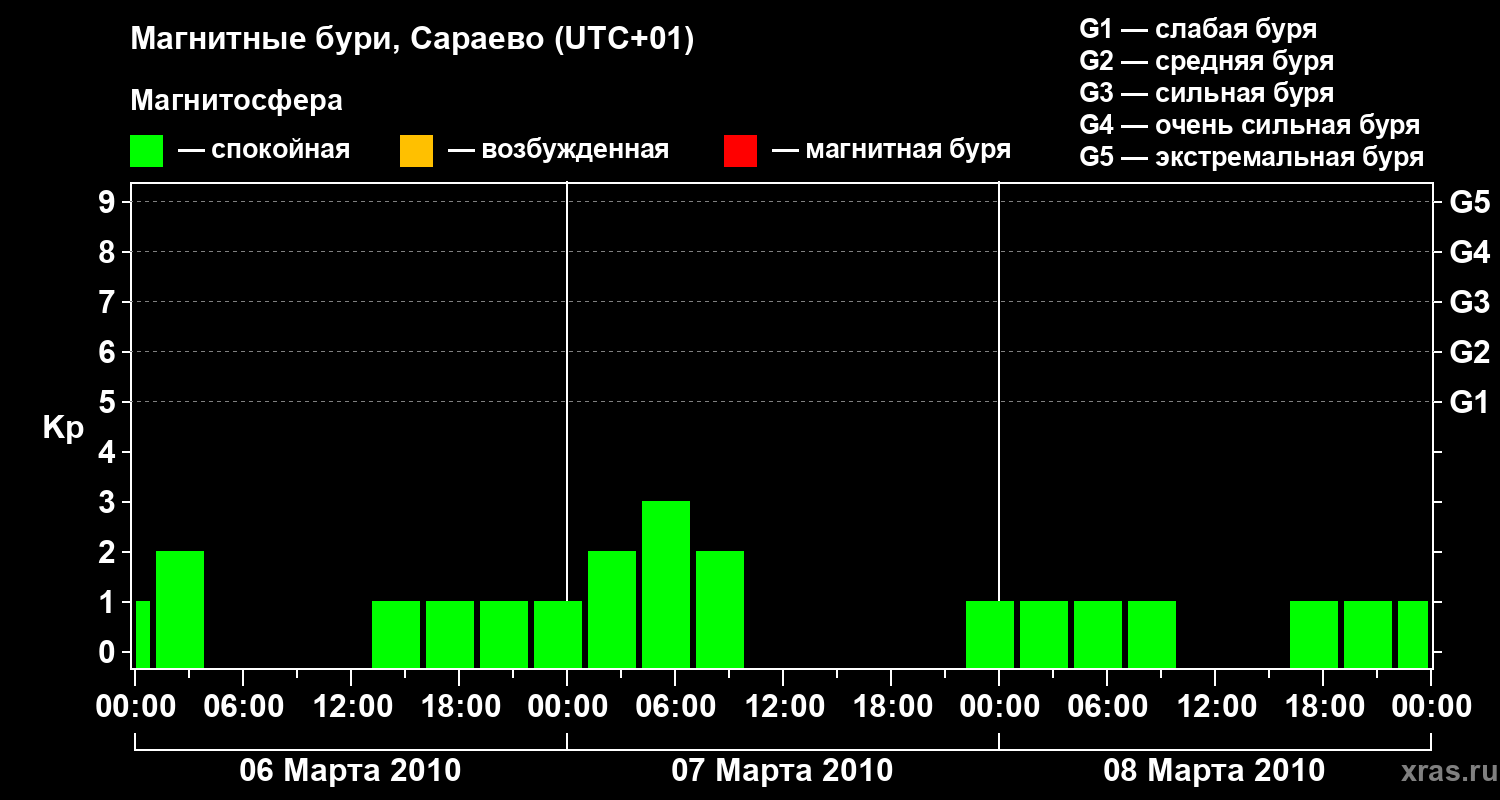 Изменения геомагнитного индекса Kp с 6 по 8 марта 2010 года для средних широт